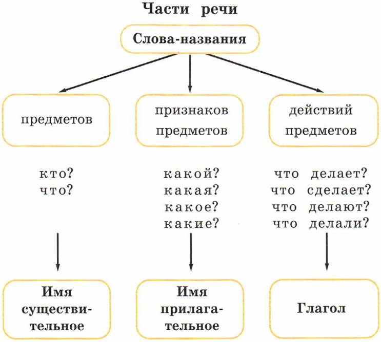 В русском языке слова объединяются в группы, которые называются частями речи. Каждая часть речи что-либо называет (обозначает): или предмет, или признак предмета, или действие предмета. У каждой части речи есть своё название: имя существительное, имя прилагательное, глагол и др.