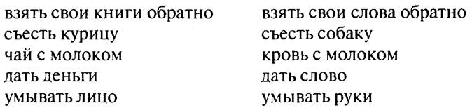 В левом столбике словосочетания свободные, они (или другие, подобные им) каждый раз создаются в речи в зависимости от ситуации. В правом столбике словосочетания связанные, неразрывные, представляющие собой целую лексическую единицу — фразеологизм. Если разрушить это единство, смысл исчезнет. Фразеологизмы воспроизводятся в памяти как готовые единицы, обладающие определённым смыслом, постоянные по своему значению, составу и структуре.