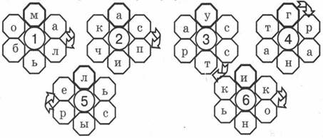 Ответы. 1. Альбом. 2. Спичка. 3. Страус. 4. Гранат. 5. Рельсы. 6. Коньки. Слово в выделенных лепестках — маугли.