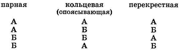 По расположению в строфе рифма бывает парная (две рифмующиеся строки рядом), кольцевая (опоясывающая) и перекрестная. Вот их схемы, где рифмованные строки обозначены одинаковыми буквами: