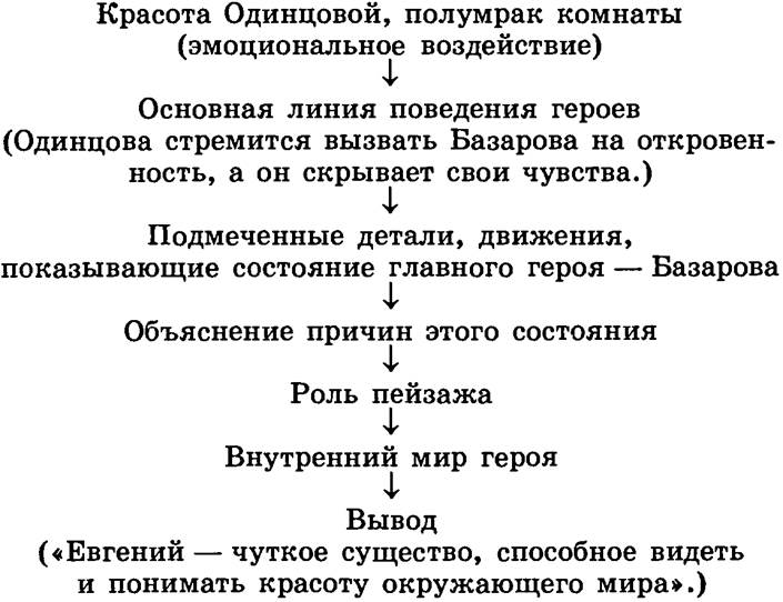 «„Он взглянул на нее. Она закинула голову на спинку кресел и скрестила на груди руки, обнаженные до локтей. Она казалась бледней при свете одинокой лампы, завешенной вырезною бумажной сеткой". Как живописен образ Одинцовой и как одурманивающе он действует на Базарова! Как великолепна, таинственна и соблазнительна она в полумраке комнаты! Во время их беседы мы замечаем, как Анна Сергеевна стремится вызвать Базарова на откровенность, а он скрывается, прячется... Одинцова попросила его открыть окно. „Базаров встал и толкнул окно. Оно со стуком распахнулось... Он не ожидал, что оно так легко отворялось; притом руки его дрожали..." Что? У этого стойкого, самоуверенного, всегда хладнокровного человека „дрожали руки"? Значит, за его отчужденностью, попыткой уйти от разговора таится огромное волнение, переживания. Одинцова затронула больное место Базарова, ведь он уже давно „с негодованием сознавал романтика в самом себе". Читаем дальше: „Темная, мягкая ночь глянула в комнату с своим почти черным небом, слабо шумевшим деревьями и свежим запахом вольного, чистого воздуха". Это описание поражает еще больше. Оказывается, Базаров, всегда отрицавший живописность природы, способен услышать „шум деревьев" и ощутить прикосновение „чистого воздуха". Этот небольшой, но прекрасный пейзаж великолепно вписывается в сцену признания. Он открывает нам душу Базарова, в которой сейчас происходит борьба между страстной любовью и ее отрицанием. Таким образом, Евгений — это чуткое существо, способное видеть и понимать красоту окружающего мира. Вспомним, как в диалоге с Анной Сергеевной он случайно оговаривается: „Зачем вы, с вашим умом, с вашей красотою, живете в деревне?"»