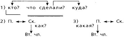 Варианты заданий (на выбор учителя): 1) подчеркнуть в предложении грамматическую основу (подлежащее и сказуемое); 2) подчеркнуть в предложении сказуемое (подлежащее); 3) выписать пары слов, связанные по смыслу; 4) разобрать предложение по членам предложения; 5) указать связь слов в предложении; 6) составить схему одного предложения (по указанию учителя); 7) выписать предложения, соответствующие одной из схем.