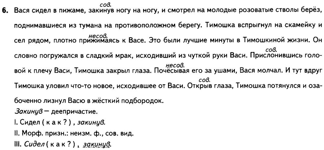 Вася с..дел в пижаме закинув ногу на ногу и см..трел на молодые розоватые стволы берёз подн..мавш..еся из тумана на противоположном берегу. Тимошка в..прыгнул на ск..мейку и сел рядом плотно пр..жимаясь к Васе. Это были лучшие м..нуты в Тимошкиной жизн... Он словно п..гружался в сладкий мрак и..ходивш..й из чуткой руки Васи. Пр..слонившись головой к плечу Васи Тимошка закрыл глаза. Поч..сывая его за ушами Вася м..лчал. И тут вдруг Тимошка ул..вил что(то) новое и..ходивш..е от Васи. Открыв глаза Тимошка (по)т..нулся и оз..боченно л..знул Васю в ж..сткий подбородок. (По П. Проскурину)