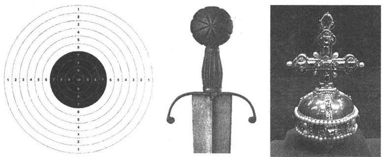 Сердцевина в мишени для стрельбы в цель — яблочко. Рукоятка меча — эфес — тоже именуется яблоком, так же как и символ императорской власти — державное яблоко.